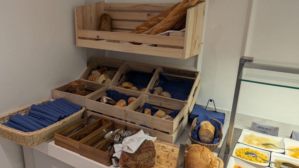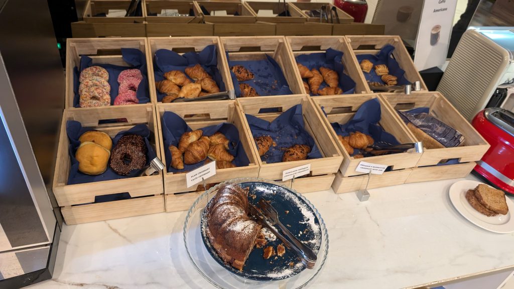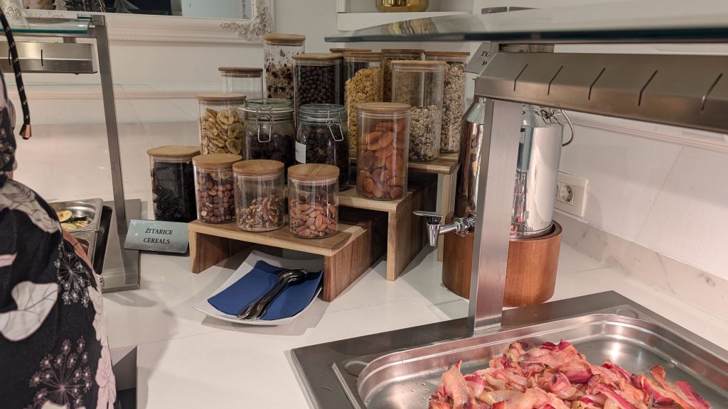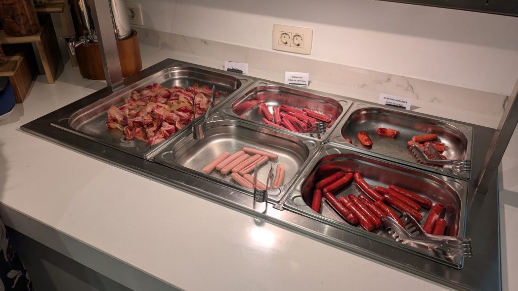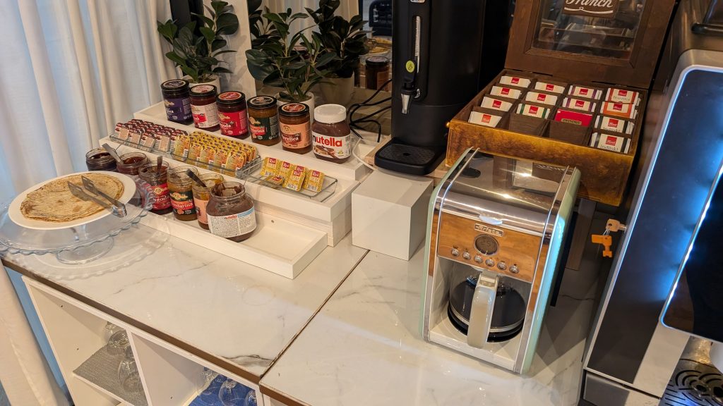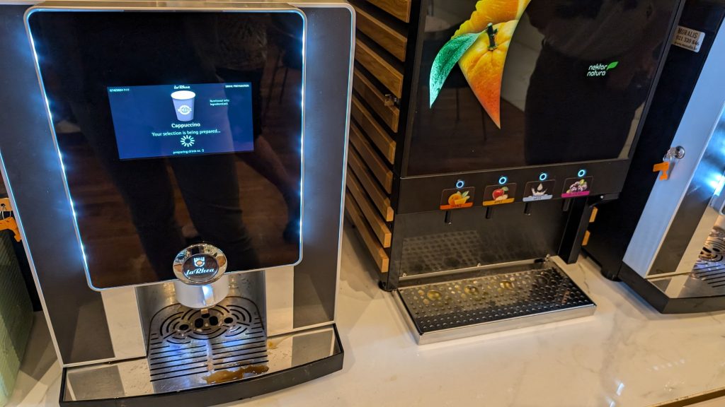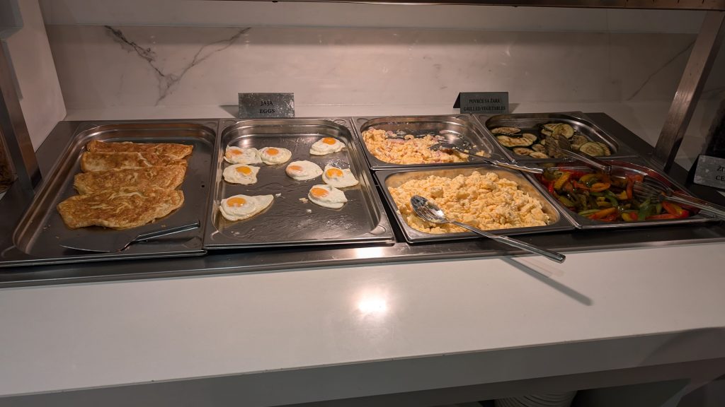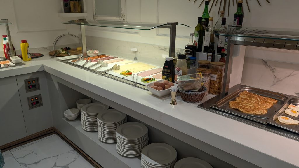 Kaffee war vielseitig verfügbar mit zwei Vollautomaten und zwei Filterkaffeemaschinen, wovon die von uns Benutzte jedoch kalten Kaffee ausgab. Die Eier waren gut – es gab Rührei, Omelettes und auch Spiegeleier, der Speck in Ordnung. Der Service beim Nachfüllen lief schnell und effizient ab. Alle Speisen waren klar beschriftet, was die Orientierung erleichterte.