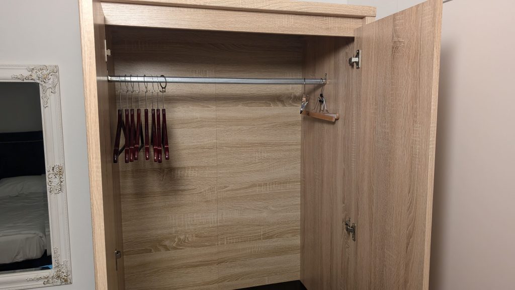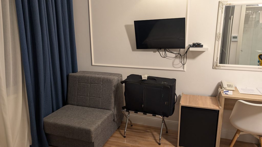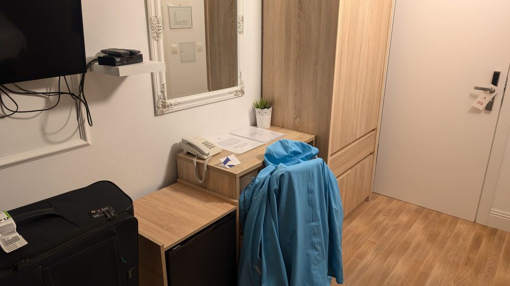Das Zimmer im Art Hotel Depandanca in Split befand sich im ersten Stock und bot einen Ausblick auf eine Gasse zwischen den beiden Hotelgebäuden. Der Raum war klein. Es gab einen Sessel als Sitzgelegenheit und einen kleinen Schreibtisch mit Stuhl. Die Ablageflächen waren begrenzt – es gab nur einen Nachtschrank, eine Kommode dafür aber einen großen Kleiderschrank und einen Kofferständer. Zusätzliche Extras wie Bügelbrett, Bügeleisen oder selbst ein Schuhlöffel fehlten komplett.