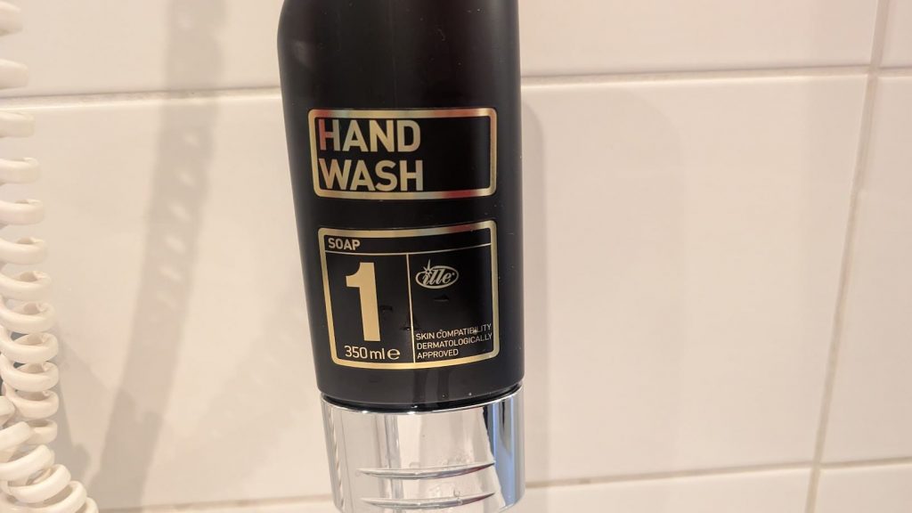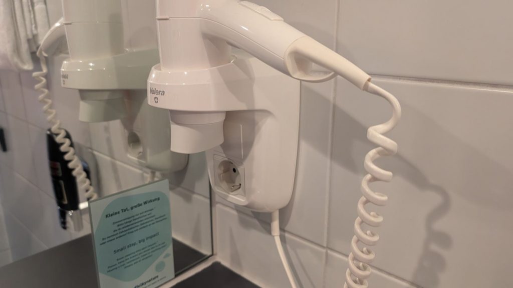 Im Badezimmer gab es keine Heizung, demnach war es dort recht kalt. Die Ausstattung des Badezimmers umfasste zwei Duschhandtücher, ein Handtuch und ein Bodentuch. Die Pflegeprodukte des Badezimmers waren in Ordnung. Der Föhn des Zimmers funktionierte gut.