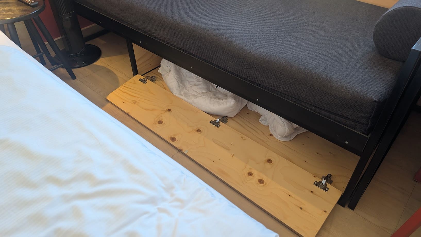 Das Zimmer im MEININGER Hotel Leipzig war kompakt und simpel aufgebaut. Das Bett des Raumes bestand aus zwei Matratzen. Das Extrabett des Zimmers war unbezogen, jedoch lag die Bettwäsche des Bettes bereit. Es gab genügend Ablageflächen sowie einen Schreibtisch und einen Ventilator. Extras wie Bügelbrett, Bügeleisen oder selbst ein Schuhlöffel fehlten komplett.