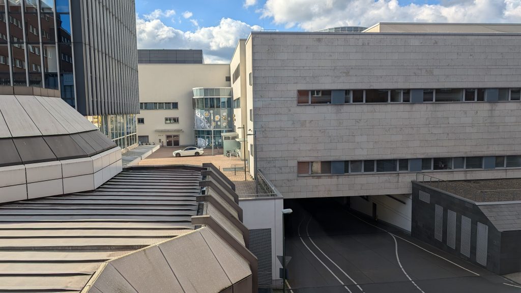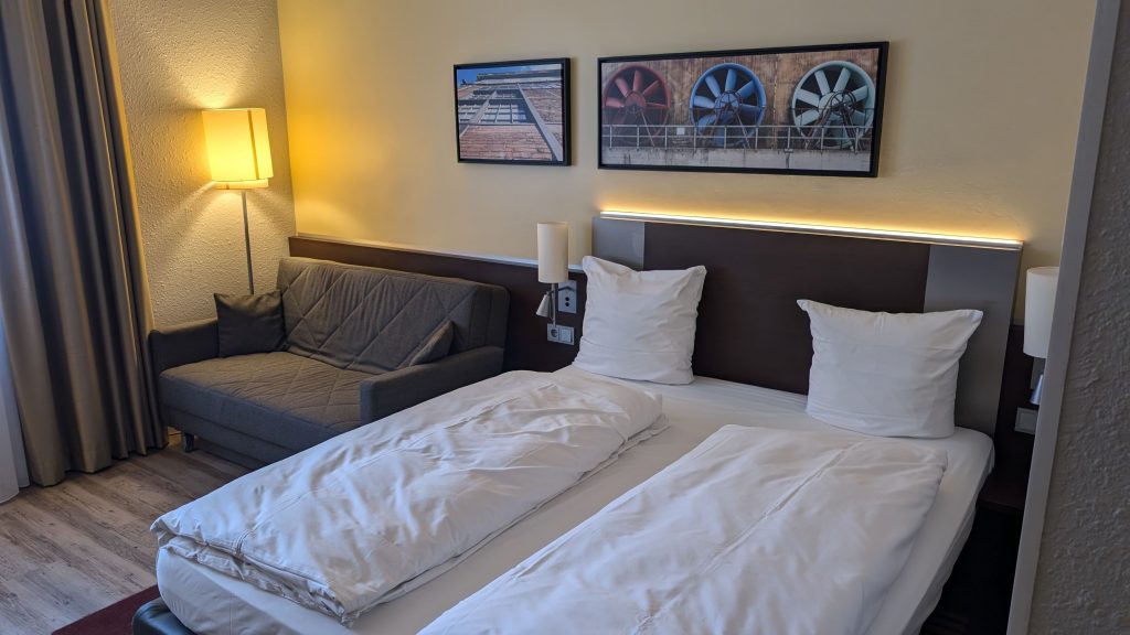 Das erste Zimmer befand sich im ersten Stock mit Blick auf einen benachbarten Casinoeingang. Es war sauber und recht gemütlich, allerdings ohne besondere Extras. Es gab etwa kein Bügelbrett, Bügeleisen, Bademantel oder Schuhlöffel. Das Bett war komfortabel, das Sofa praktisch zum Fernsehengucken auf dem modernen Fernseher und der Arbeitstisch ist sehr gut zum Arbeiten geeignet. Es gab ausreichende, aber nicht besonders großzügige Ablageflächen. Zwei Bilder von Industrieanlagen schmückten das Zimmer – Geschmackssache, aber sie verliehen dem Raum einen gewissen Duisburger Charme.