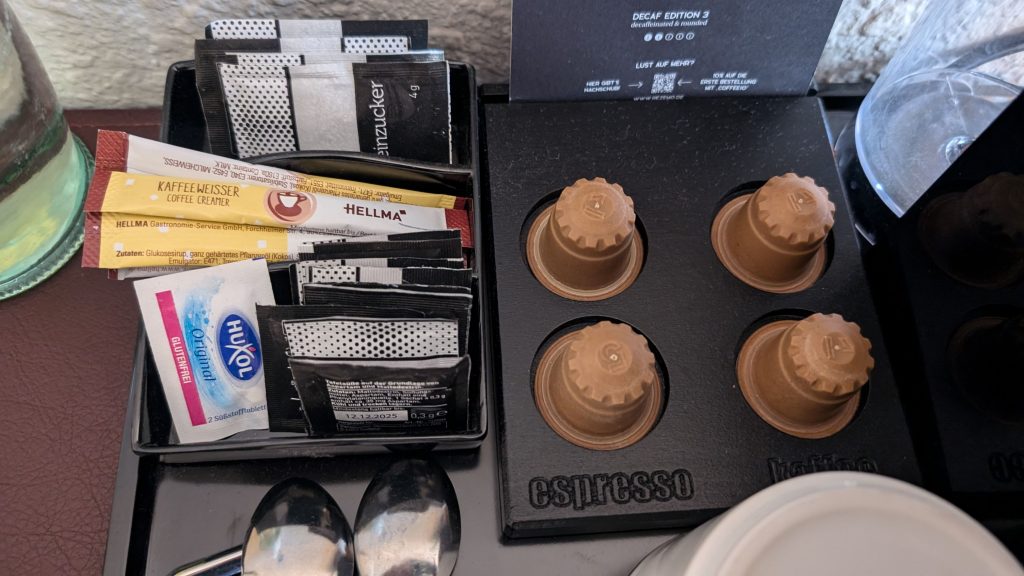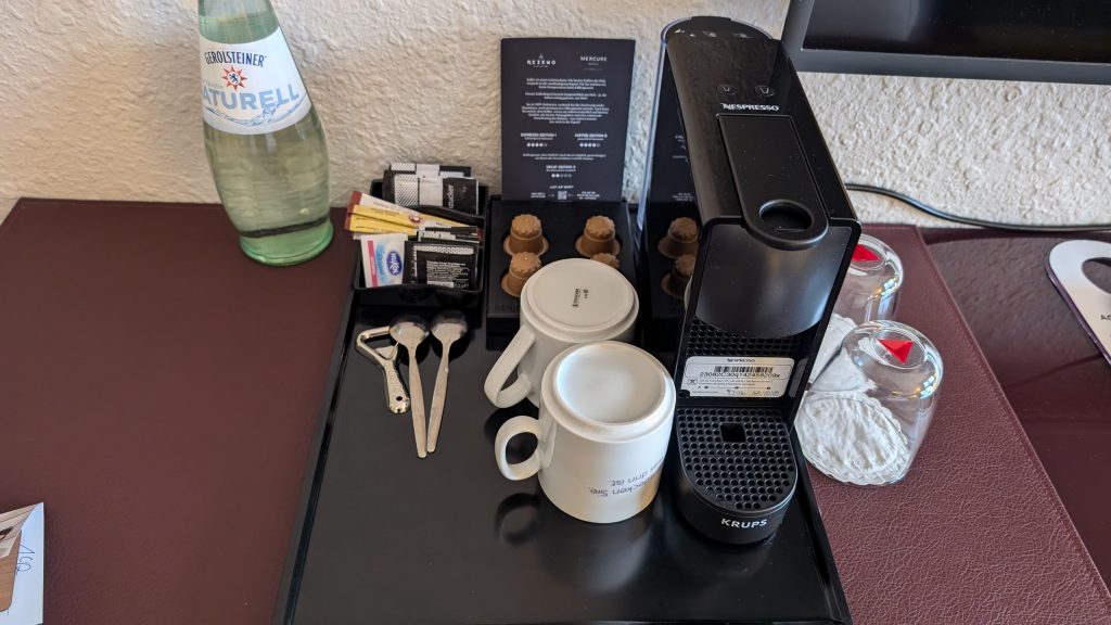 Das zweite Zimmer war im fünften Stock und wurde kostenlos auf ein Zimmer mit kostenloser Minibar upgegraded. Zudem standen für beide Zimmer jeweils vier Kapseln für eine Nespresso-Maschine zur Verfügung. Auch Kaffee und Wasser waren inklusive, was den Aufenthalt noch angenehmer machte.