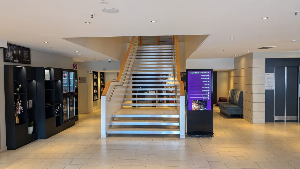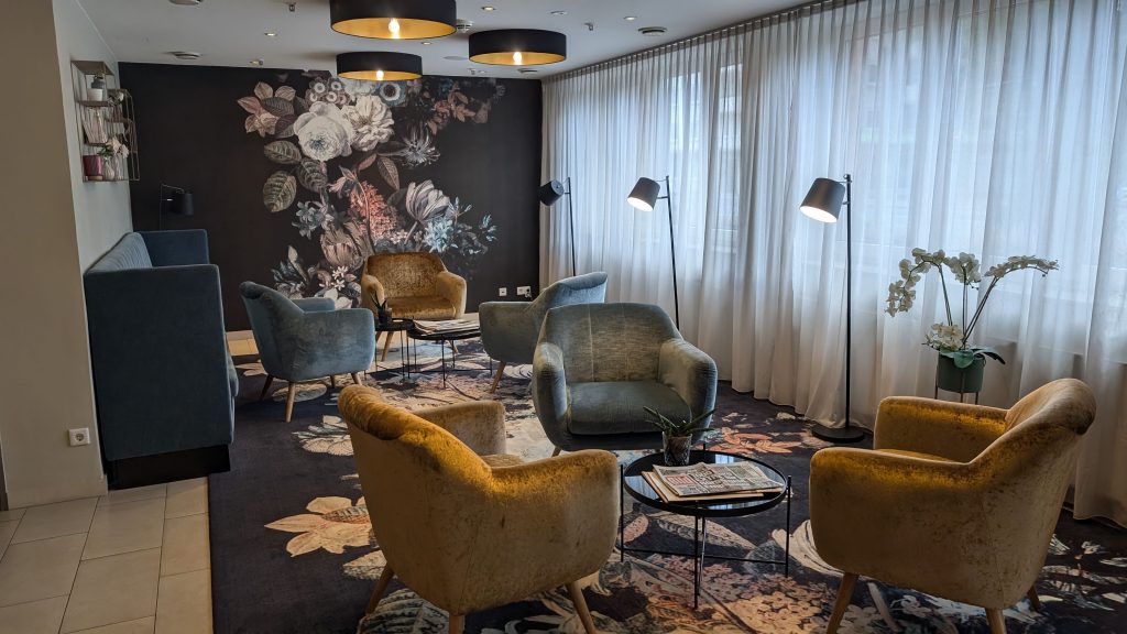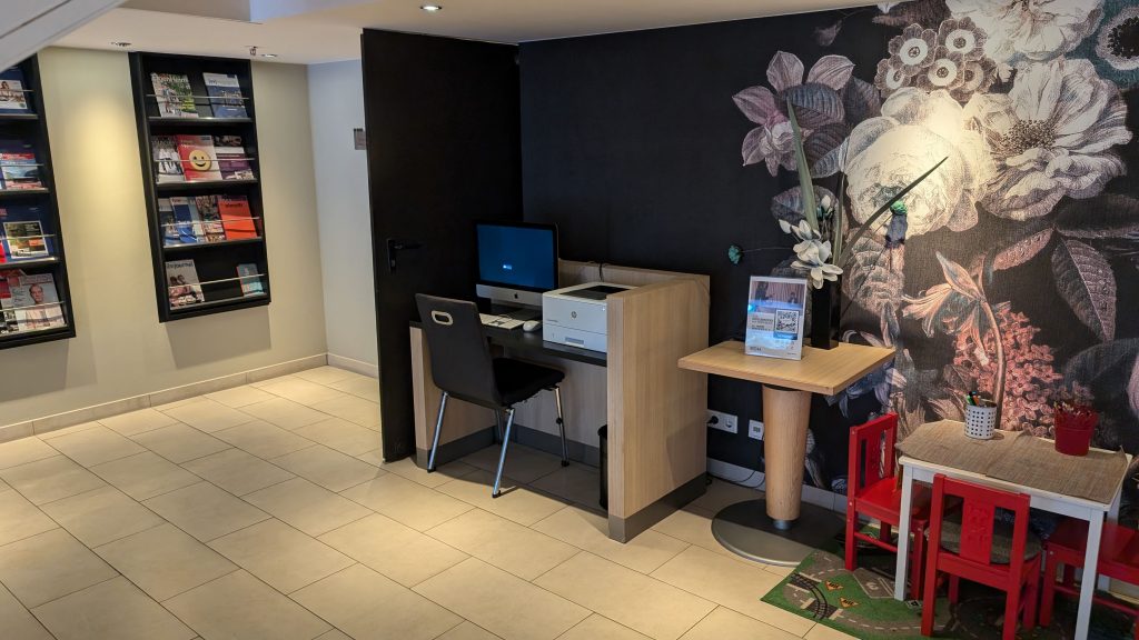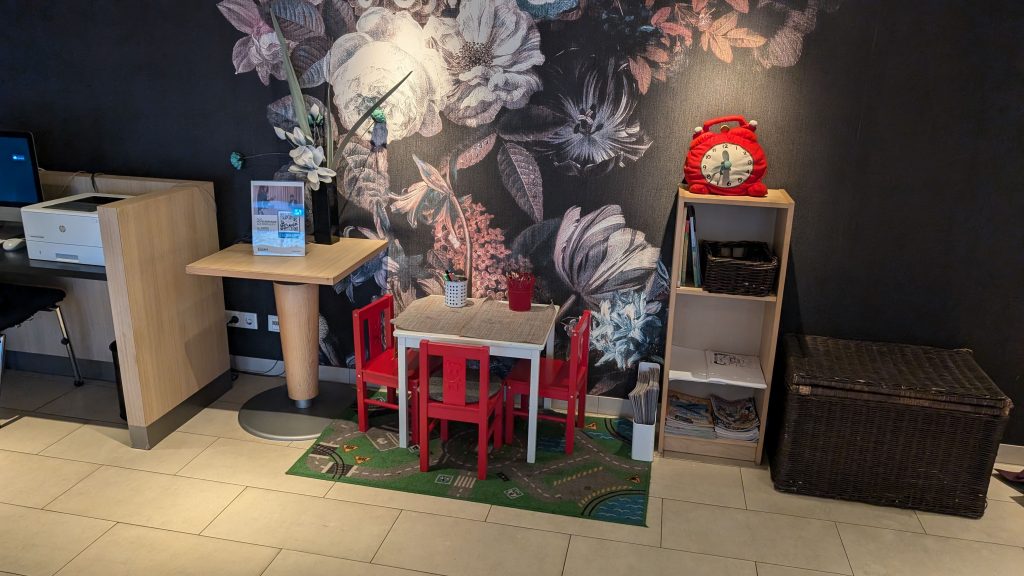 Die Lobby ist klein und schick. Es gibt einen kleinen Empfang, eine Sitzgruppe mit ausreichend Sitzmöglichkeiten und vor allem die Treppe, die ins Restaurant und die Bar führt. Durch die tiefe Decke und die große Treppe wirkt der ganze Raum allerdings recht bedrückend. Schön war, dass es einen kleinen Arbeitsplatz mit Drucker gab. Daneben war ein Mini-Spielbereich für Kinder eingerichtet.